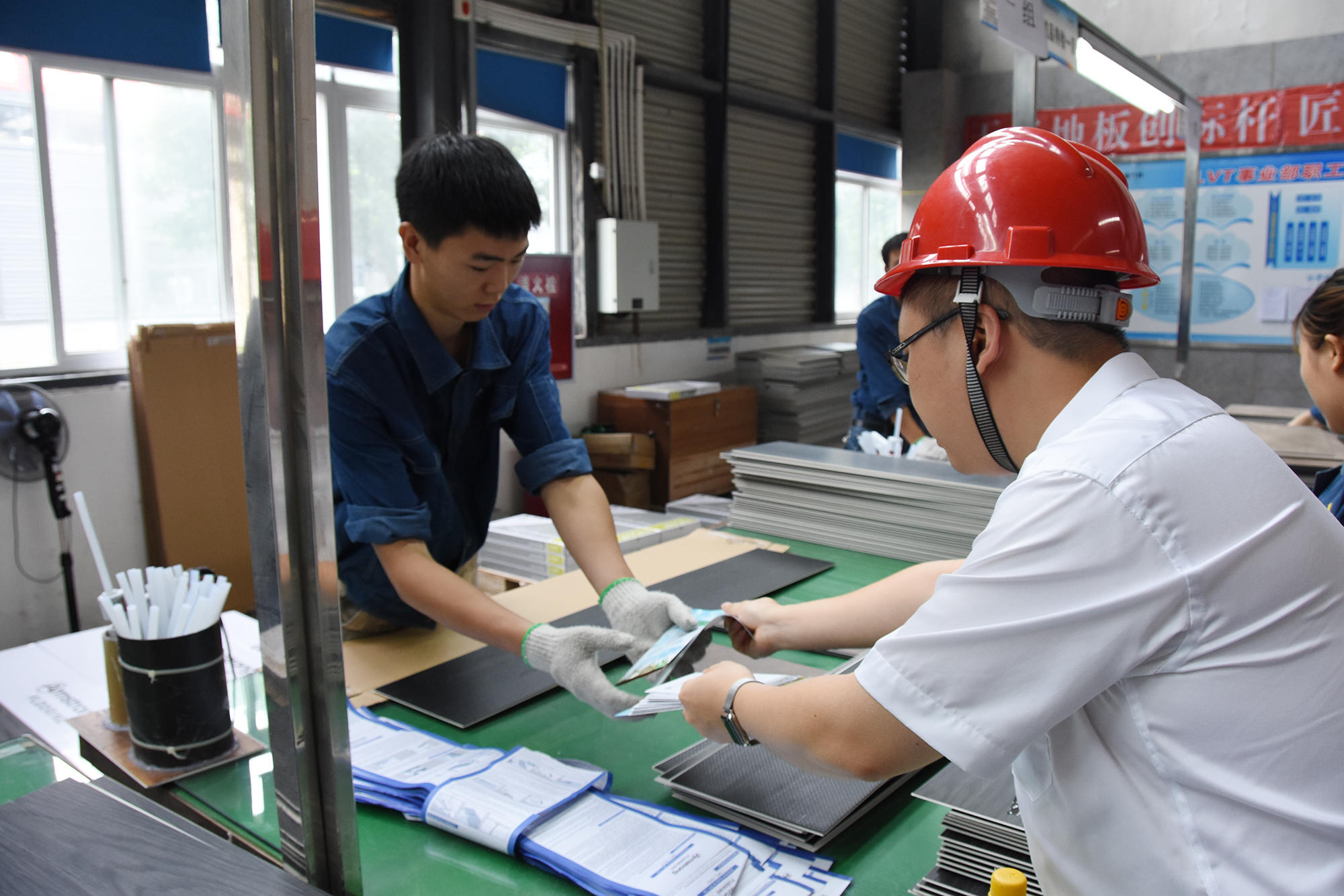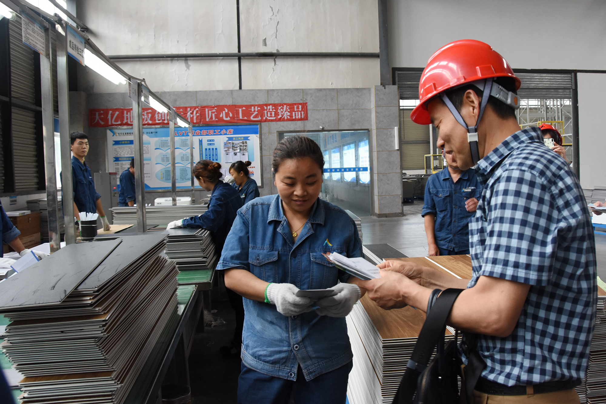 卿章林一行在天億新材料公司LVT生產(chǎn)車間,了解企業(yè)生產(chǎn)和職工勞動防護情況,現(xiàn)場聽取了相關負責人對LVT產(chǎn)品特性、應用領域等方面情況介紹。在現(xiàn)場,卿章林一行為員工發(fā)放工傷保險政策宣傳單,就工傷保險政策與員工進行宣傳交流。