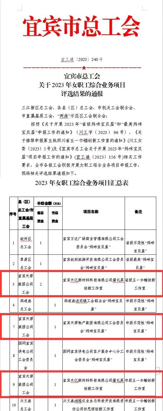 近日,宜賓市總工會公布了2023 年女職工綜合業(yè)務項目評選結(jié)果,天原集團多個項目榜上有名,其中,下屬宜賓天億新材料科技有限公司蒲禮英創(chuàng)新工作室榮獲“省級五一巾幗創(chuàng)新工作室”“市級五一巾幗創(chuàng)新工作室”兩項稱號,下屬宜賓天原物產(chǎn)集團有限公司工會委員會“媽咪寶貝屋”榮獲市級示范性“媽咪寶貝屋”稱號。