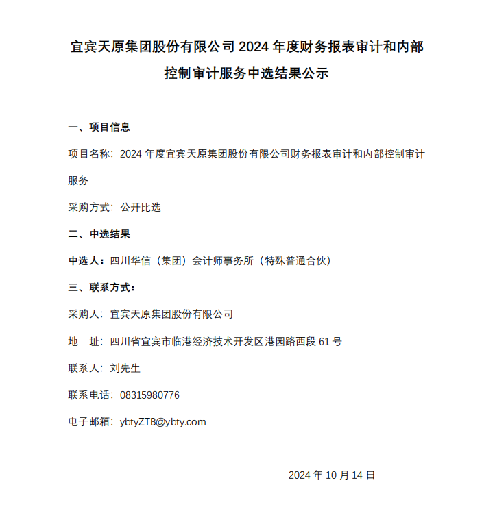 宜賓天原集團股份有限公司2024年度財務報表審計和內部控制審計服務中選結果公示